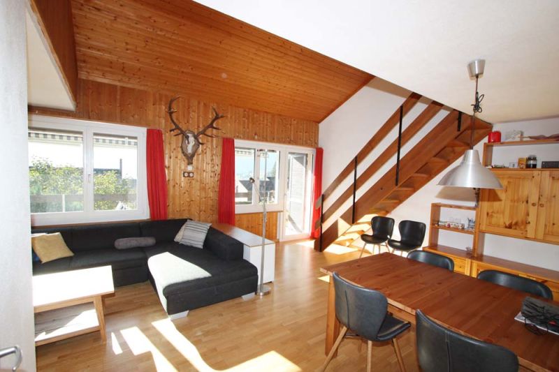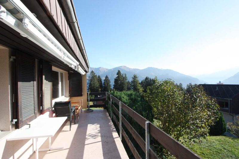 EG: Haupteingang 5.5-Zi.-Wohnung, Abstellraum mit Boiler und Öltank, Garderobe, Dusche/WC/Lavabo/Fenster, Loft-Wohn-Esszimmer mit Ausgang zur Terrasse, Schlafzimmer, Arbeitsküche mit Fenster, grosser Balkon mit Sonnen-Marquisen und schönem Blick auf das Bergpanorama.