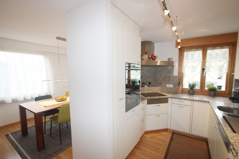 Renoviert 2011 usw.; Bj. 1974, innen komplett modernisiert, hell, sonnig, Wohnfläche netto ca. 130 m2, in kleinem MFH mit nur 3 Einheiten, grosser Balkon, Oel-Zentralheizung mit Radiatoren, Warmluft-Cheminée, Kellerabteil, Estrichabteil, Einzel-Garagebox, an kleiner Quartierstrasse, Isolier-Verglasung. Wasch-Trocknungsraum mit eigenen WM-TU-Geräten. Zusätzlich ein Wäscheentfeuchter.