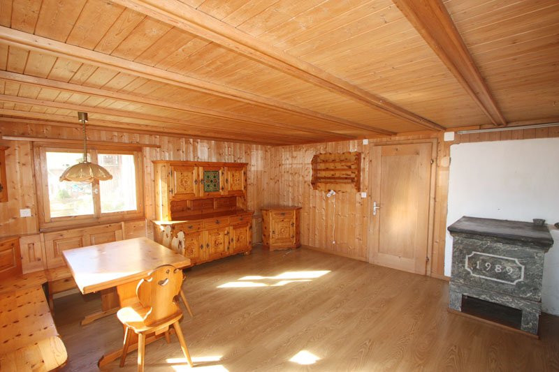 EG: Küche mit Sitzecke, Wohnzimmer mit Stubenofen, 1 Zimmer, 1 Zimmer mit Kachelofen und sehr kleiner Küchenanlage (Wohnzimmer), WC, Bad mit Waschmaschine, Holzschopf aussen.